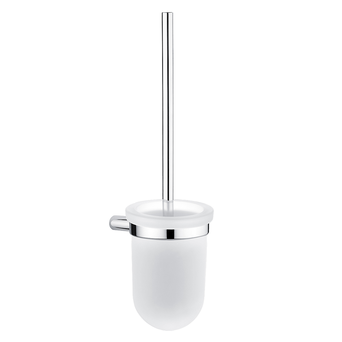 WC štětka s nádobkou z matného skla, nízká. Rukojeť kartáče z mosazi s povrchovou úpravou chrom.