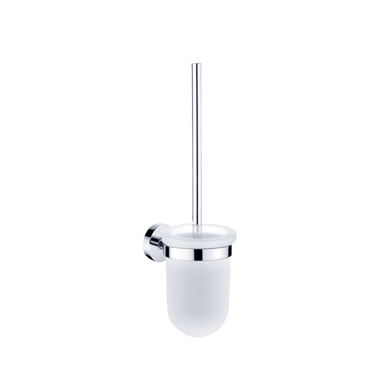 WC štětka. Nádobka nízká z matného skla. Rukojeť kartáče z mosazi s povrch. úpravou chrom.