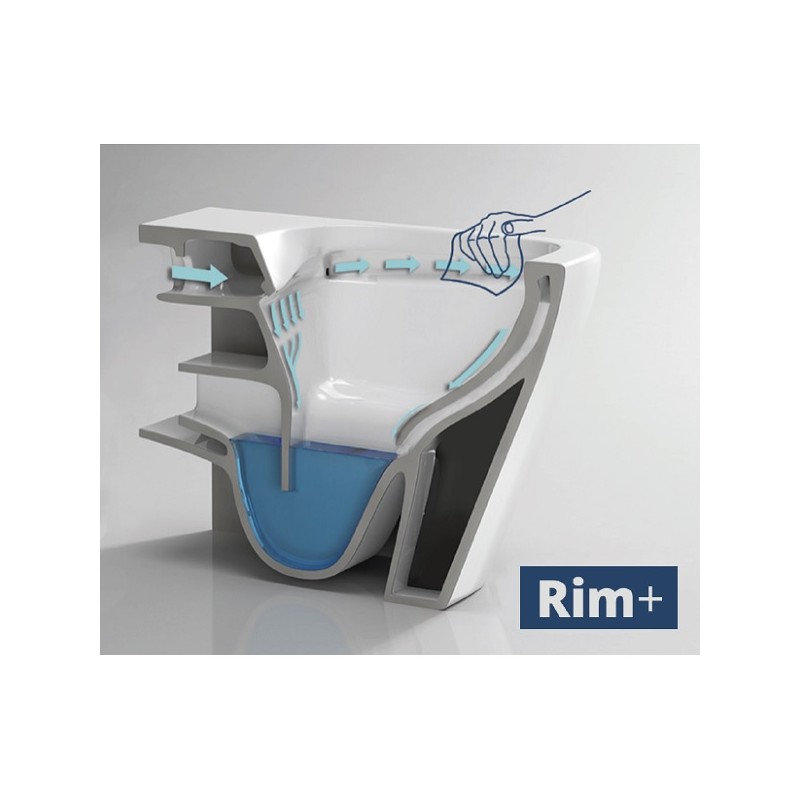 Keramická WC toaleta Rim+ má otvorený okruh splachovania, vďaka ktorému sa dá ľahko vyčistiť vnútorný priestor WC misy. Bez oplachového lemu a vďaka inovatívnemu toku vody vnútri toaletnej misy nevznikajú žiadne nedostupné skrýše pre baktérie, toaletná misa je dokonale hladká. Špeciálna konštrukcia toalety umožňuje precízny oplach prúdom vody bez nutnosti dočisťovania. Je ideálnym riešením pre tých, ktorí dbajú na perfektnú čistotu, hygienu a ľahkú údržbu.